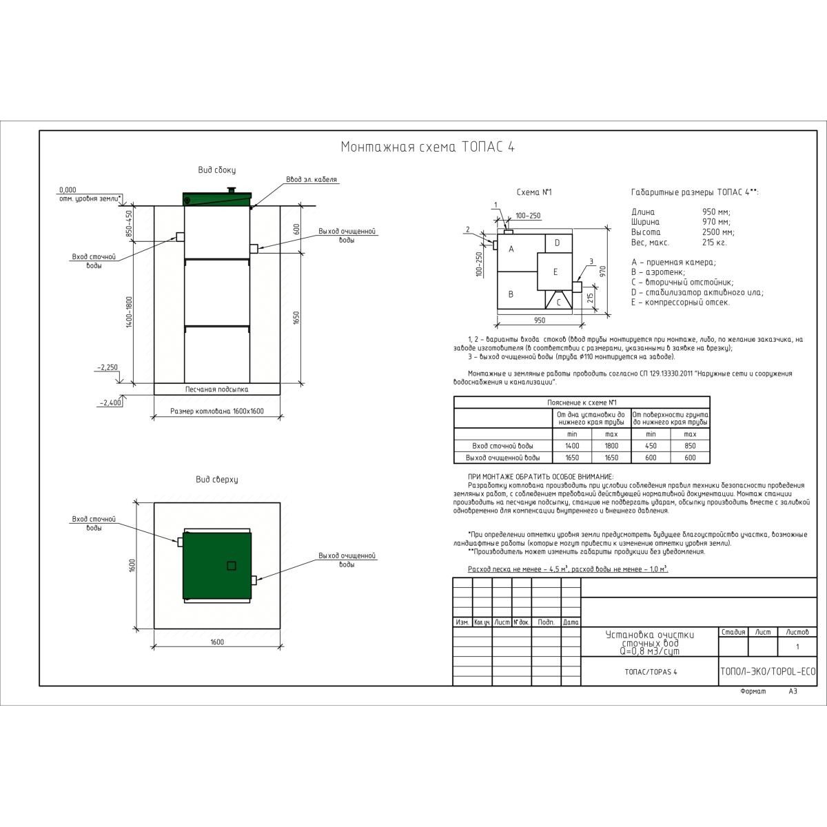Dacă de la 1 la 4 persoane locuiesc în casa dvs. la țară, cabană sau cabană, și o cabină de duș, un vas de toaletă și două chiuvete sunt instalate de la instalații sanitare, atunci instalația TOPAS 4 vă va potrivi. Acesta este un sistem de canalizare autonom conceput pentru utilizare pe tot parcursul anului sau sezonieră. Aportul maxim unic de apă uzată, adică volumul de apă pe care TOPAS 4 îl poate primi într-o perioadă scurtă de timp, este de 175 litri. Gradul de tratare a apelor uzate este 98%.